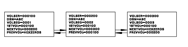 Understanding the various structures found in the TMC is helpful in correcting any errors reported. Multivolume chains are carried in five fields of each TMC Volume record associated with the data set, VOLSEQ, VOLSER, 1STVOL, NEXTVOL and PREVVOL, using forward and backward pointers. All Volume records in a volume chain must contain the same value in the 1STVOL field.