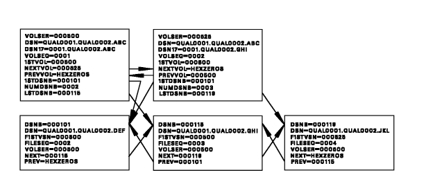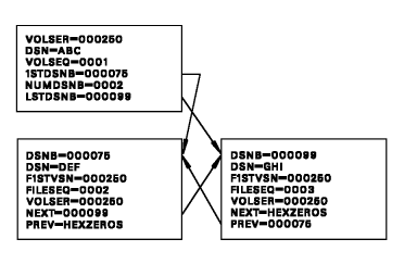 Multi-data set chains are reflected in three fields of the TMC Volume record, 1STDSNB, LSTDSNB, and NUMDSNB, and in three fields of the DSNB record, VOLSER, PREV and NEXT. DSNB chains are constructed with forward and backward pointers. All DSNB records in a DSNB chain must contain the same value in the VOLSER field.