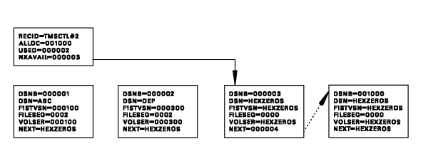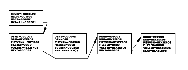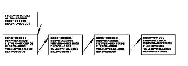 The free chain of DSNBs, that is, those DSNBs that are unused and available to track new secondary data sets, is maintained through a pointer field, NXAVAIL, contained in Control Record #2 (TMSCTL#2) of the TMC. In a newly formatted TMC, the DSNBs are consecutive off of Control Record #2. All unused DSNB records in the free chain should have bit DSNBACTV of the active indicator field (ACTIND) turned off. The last DSNB should never be used and must always contain HEXZEROS in the NEXT field.