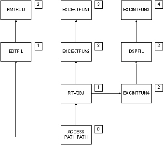 The arrows indicate the usage sequence for the functions that use the access path. The numbers in the small boxes indicate the usage level of each object relative to the access path at level 0.