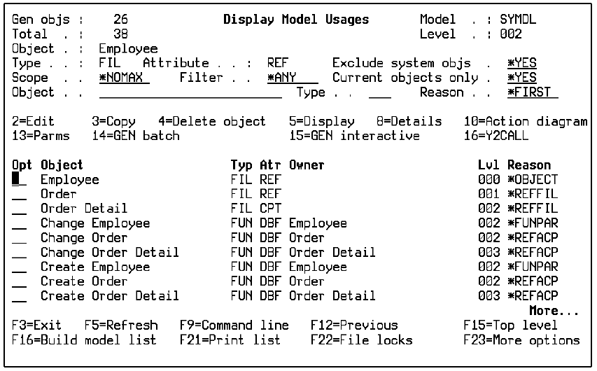 If you choose to display usages, begins by displaying the contents of the list you specified, updated to reflect the current state of each model object from *ALLOBJ. This is indicated by *ENTRY in the Reason column for each model object. The name of the originating model object list is shown in the Converted List field in the upper-left of the screen. Note that the original list is not changed by this process.