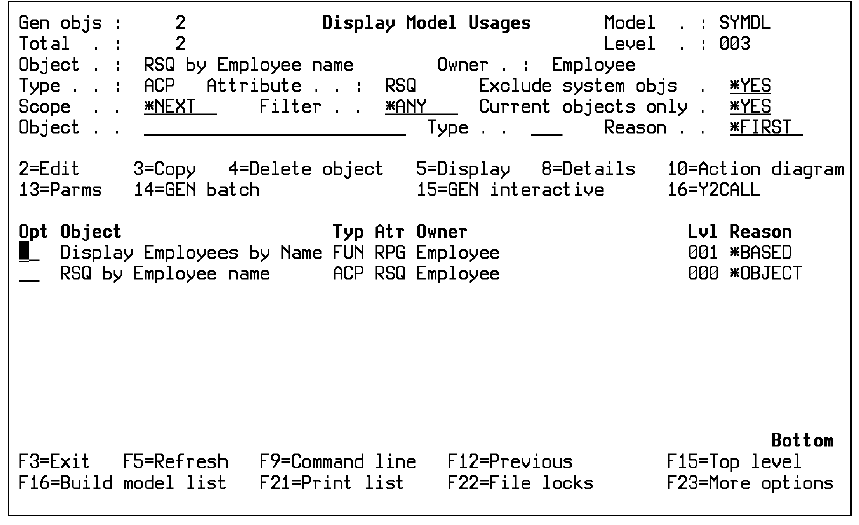 Note: From here on the process shown in this example is the same for both methods of working interactively with usages; namely, whether you pressed F20 or typed selection option 91 against a model object.