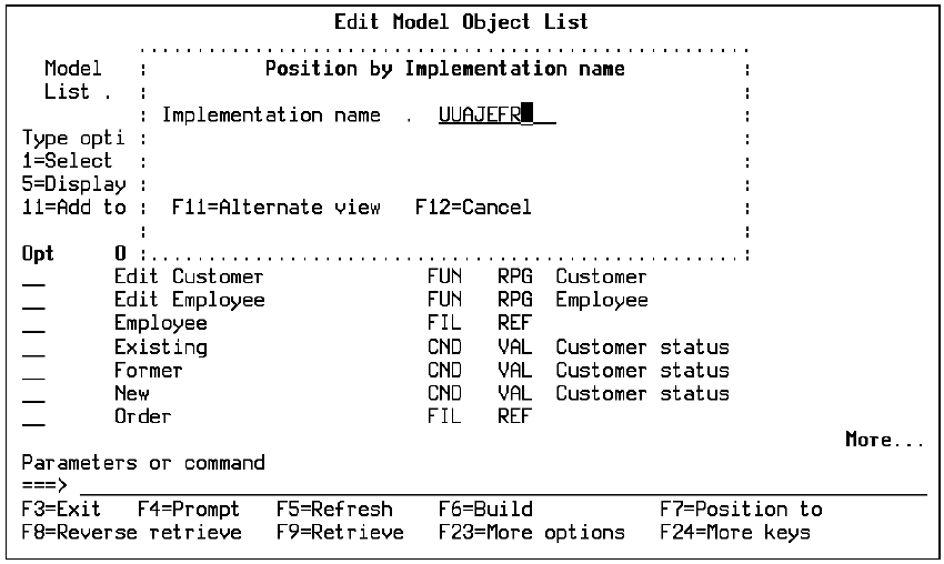 Use the Edit Model Object List panel over the All Objects list (*ALLOBJ). Press F7 to display the positioning windows. Press F11 until the Position by Implementation name window displays: