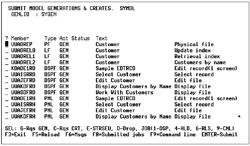 A job list of the source members you have requested for generation and compilation appears on the Submit Model Generations & Creates panel.