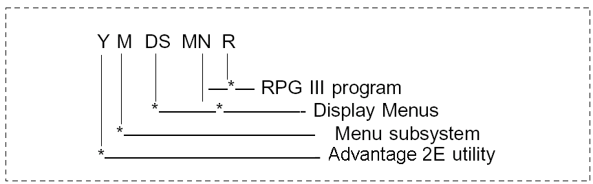 CA 2E uses a systematic naming convention for application systems whose main language is RPG III. Overall, the naming convention’s aim is to encode appropriate information about entity type, attribute, and application into the names of objects and object components as shown in the following schematic example.