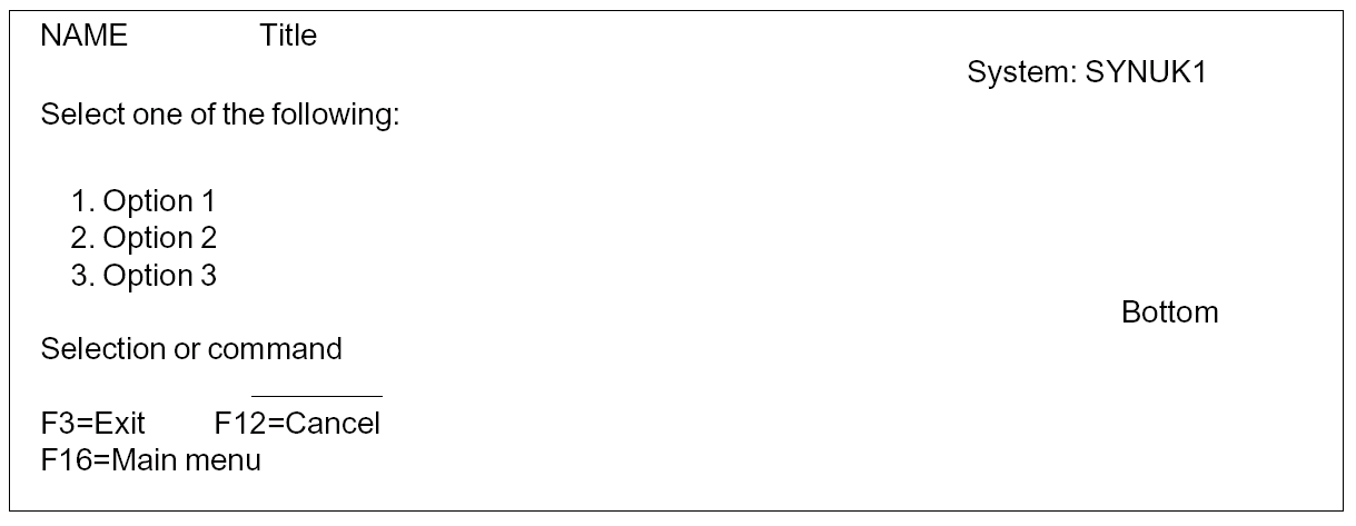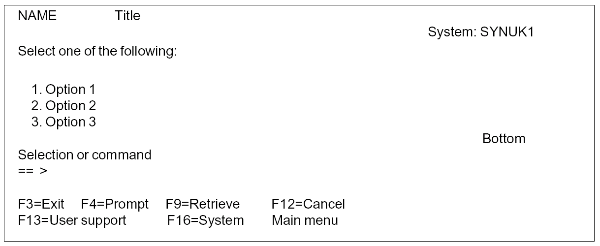 Your application menus should follow the OS/400 user interface standards for menus, as seen on the OS/400 system displays.