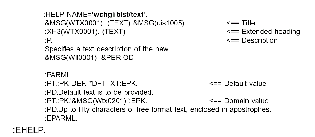 For each parameter, state the keyword and prompt, and list the allowed values. The default value should be shown first, (for example, *NONE), then other special values, (for example, *ALL), then the domain name (for example library-name, member-name, ‘text’).