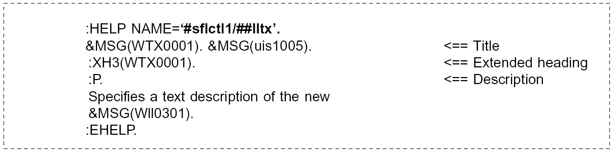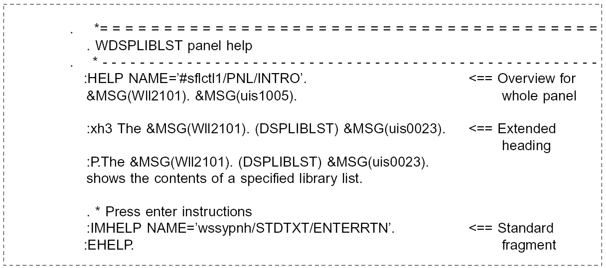 Provide an introductory section for each panel, beginning with the panel’s name, for example, ‘The Display Library List (wchgliblst) panel’. This will be used as the default text for the panel. The name of this help group should have the form ‘Format name/PNL/INTRO’.