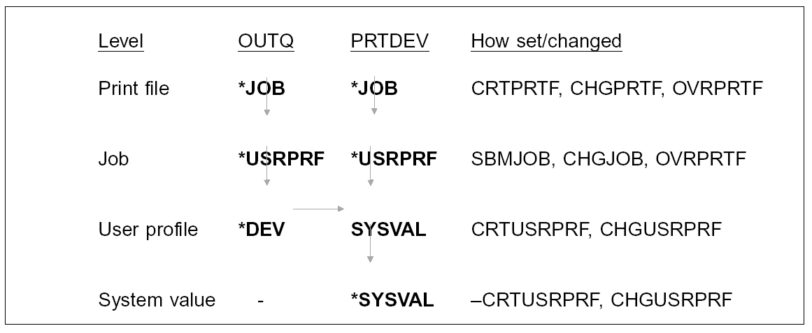 There are several levels at which the location of printed spooled output may be controlled under OS/400. For convenience, the levels are summarized below. Note that OS/400 has a number of additional capabilities, in particular the PRTDEV parameter.