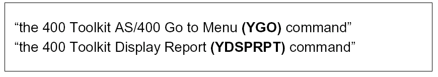 Give references to commands, both OS/400 and user-defined, in the following format: