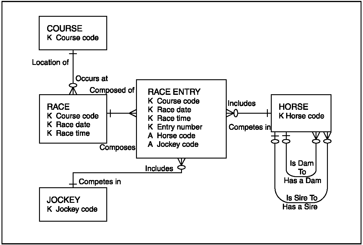 At this point, there is another source of redundant data, namely, the HORSE, DAM, and SIRE entities. A horse could appear in two of these three entities since a horse could both compete in races and also be a Dam or Sire. This situation can be resolved by combining these three entities into just one: HORSE. This process is called entity generalization.