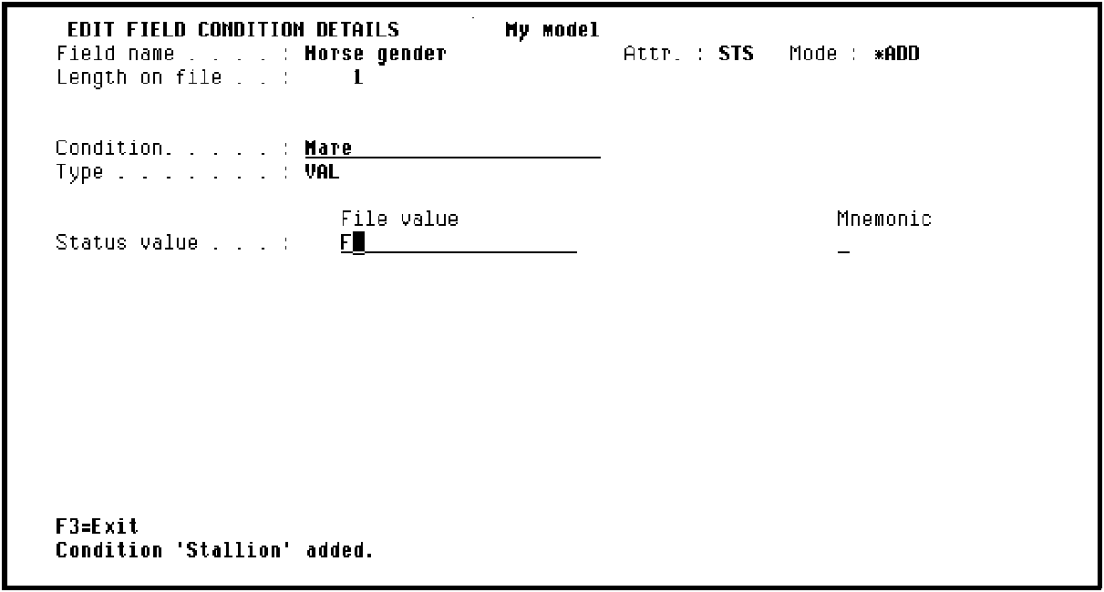 In this case, you can overwrite Stallion with Mare, and M with F. Type the details of the next condition.