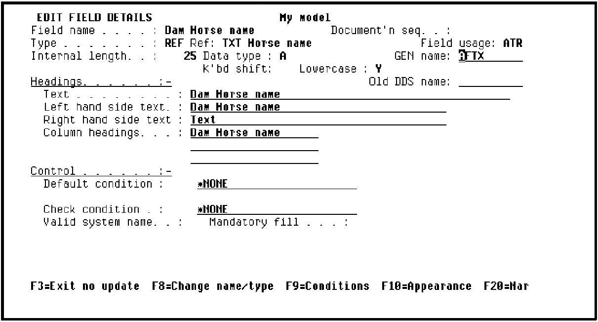 The Edit Field Details panel lets you view details for the field, Dam Horse name. Some of the attributes of the field, such as the name, are initially protected. The F8 key unprotects the field name so it can be changed.