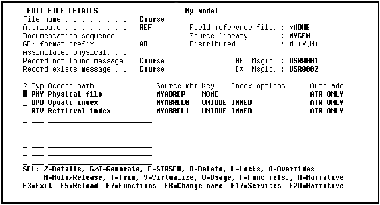 The access paths for a file are recorded on the Edit File Details panel. To obtain this panel for the COURSE file, you will zoom against one of the relations for the file on the Edit Database Relations panel. Type Z against one of the relations for the COURSE file.