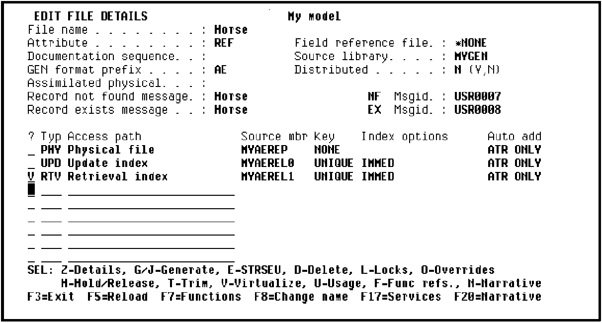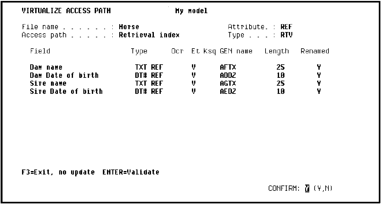 Press Enter to validate the addition of the virtual fields to the Retrieval index access path for the HORSE file.