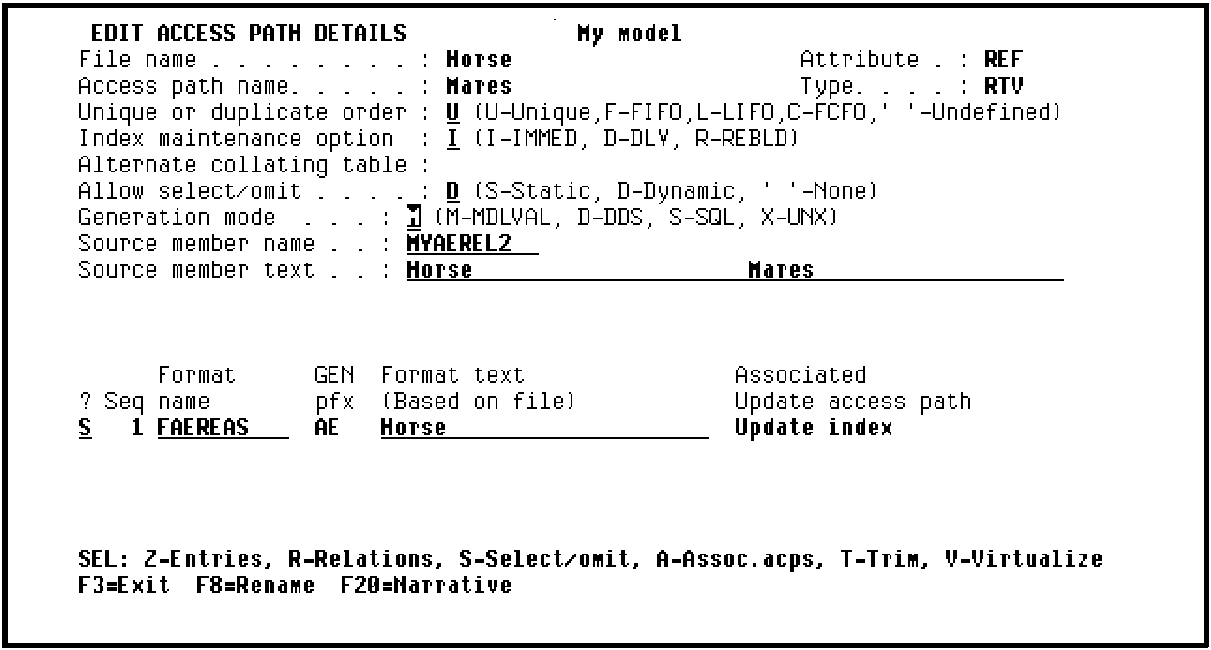 To specify the condition that mares must be female for the Mares access path, create a select/omit set for the access path, and attach conditions to this set. Type D in the Allow select/omit field to select Dynamic i OS selection and type S in the Subfile selector to define the select/omit criteria.