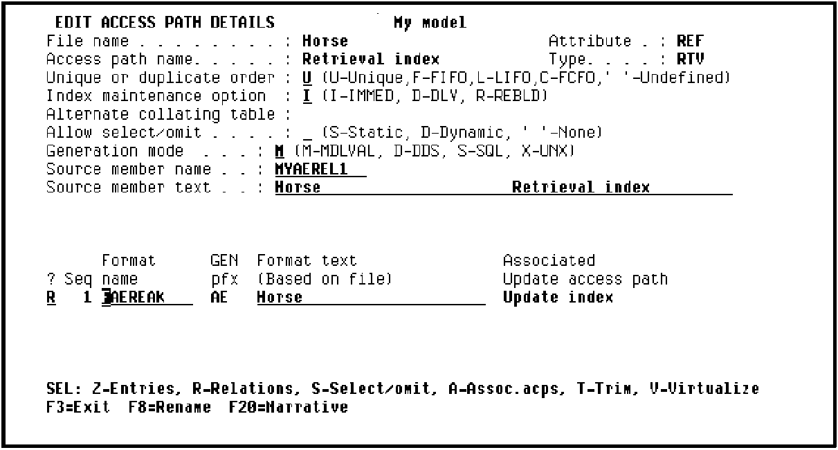 You are now ready to view the list of access path relations for the HORSE Retrieval index access path. Type R in the Subfile selector.