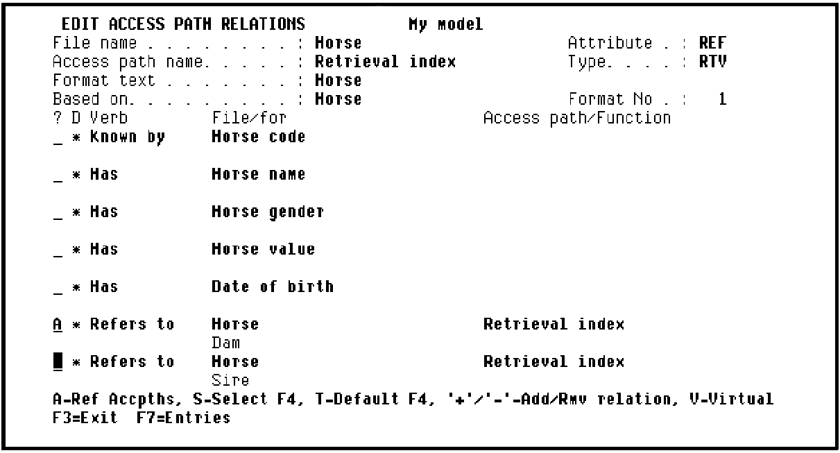 To change the referenced access path used by the HORSE Refers to HORSE For Dam relation, type A against the relation.