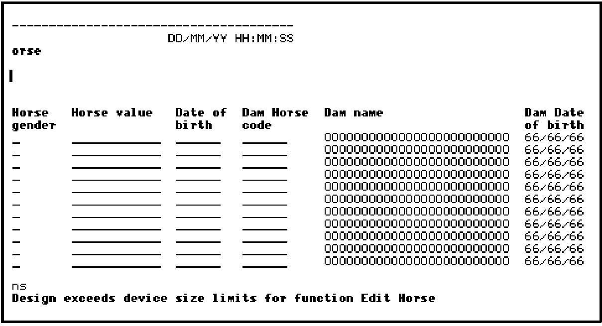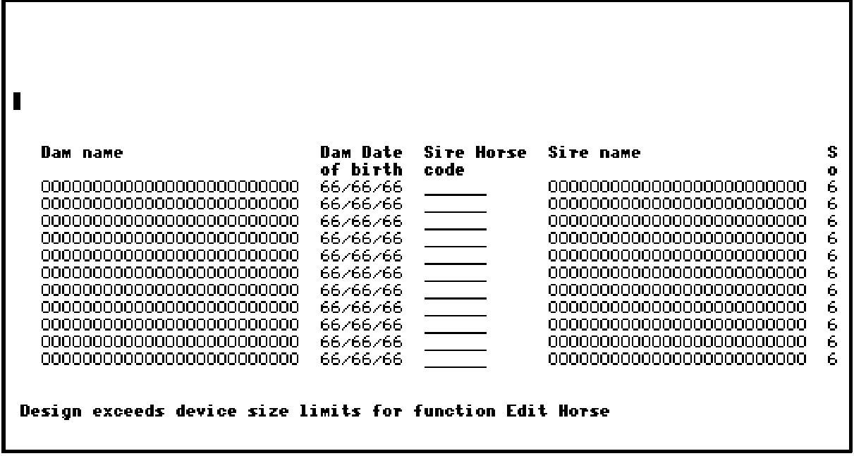 Note the virtual fields, Dam name and Dam Date of birth that you added to the default Retrieval access path for the HORSE file. If you had not explicitly added these fields to the access path, they would not appear on this display.