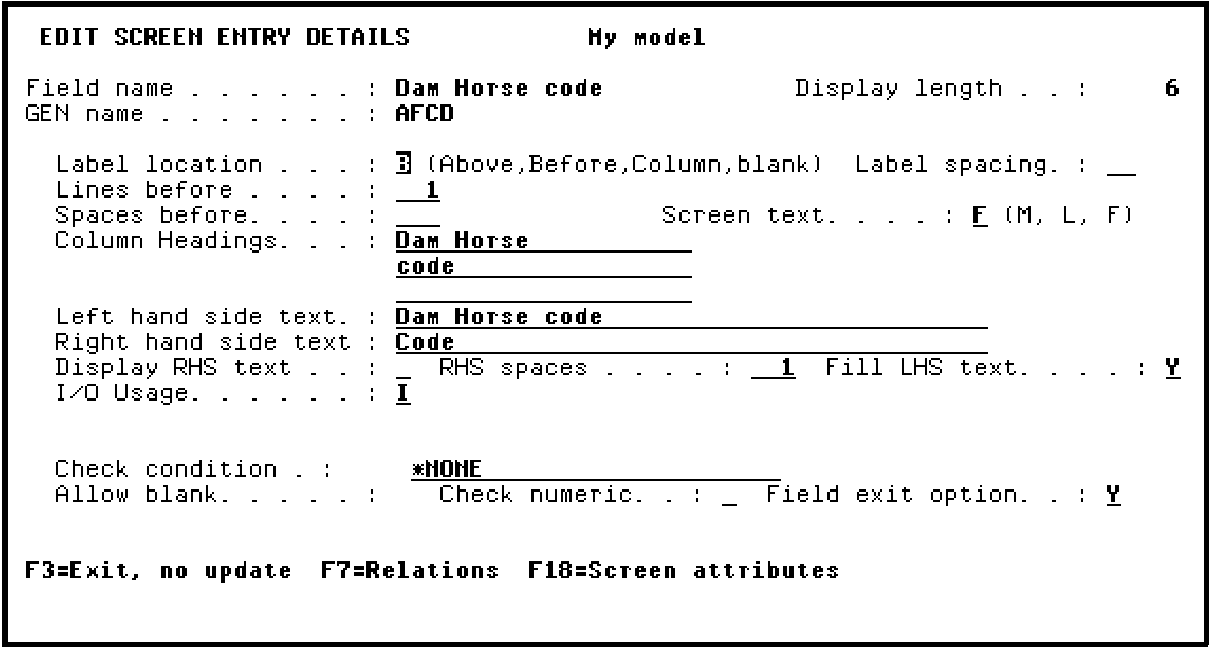 To display the field entry details for any field, place the cursor on that field or its label in the first subfile record and press the Enter key. To display the field entry details for the Dam Horse code field, place the cursor on the field.