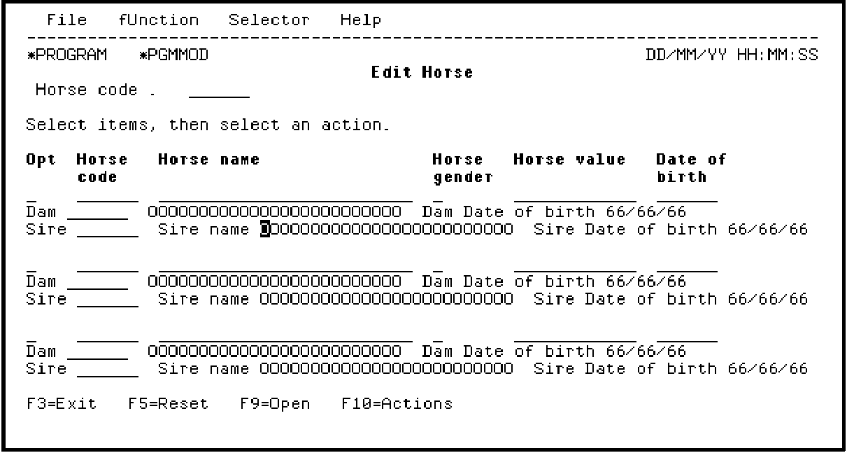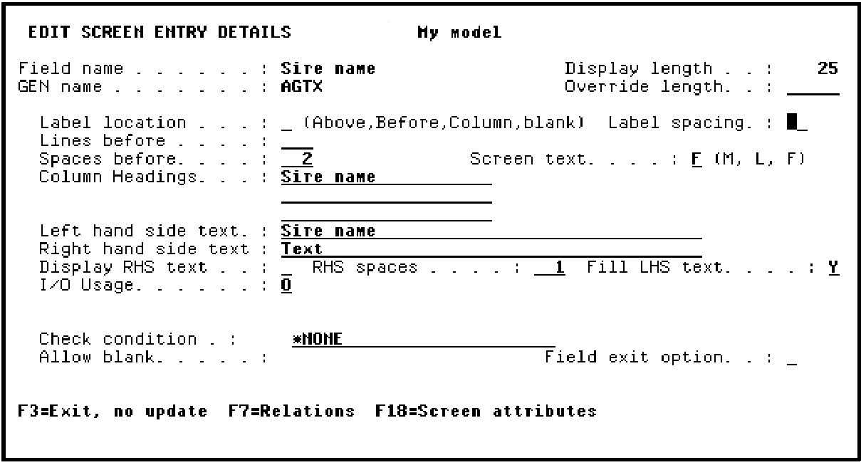 Notice the value of B (Before) in the Label location field; this caused the LHS text to appear as a label before the Sire name field. To remove the label, change the Label location field from B to blank.