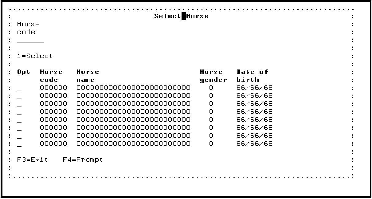 In this step you will reduce the dimensions of the Select Horse window so that it just surrounds all remaining fields as part of the device design. You can access the Window Options Editor from the function title. Position the cursor on the function title.