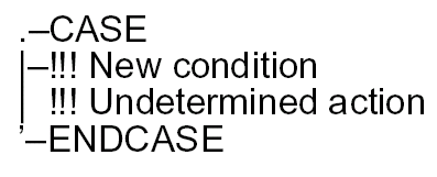 This is a generic definition of a conditional construct; where, !!! New condition indicates a conditional statement and !!! Undertermined action indicates the action to be performed if the condition is true. You can use these general structures to check the program logic. After you are sure the logic is correct, you can specify the details of the conditions and actions.