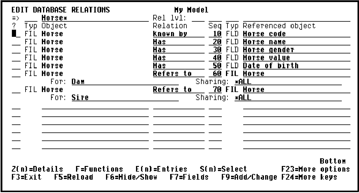 Type F against one of the relations and press Enter to display functions for the HORSE file. Type F against the Edit Horse function.