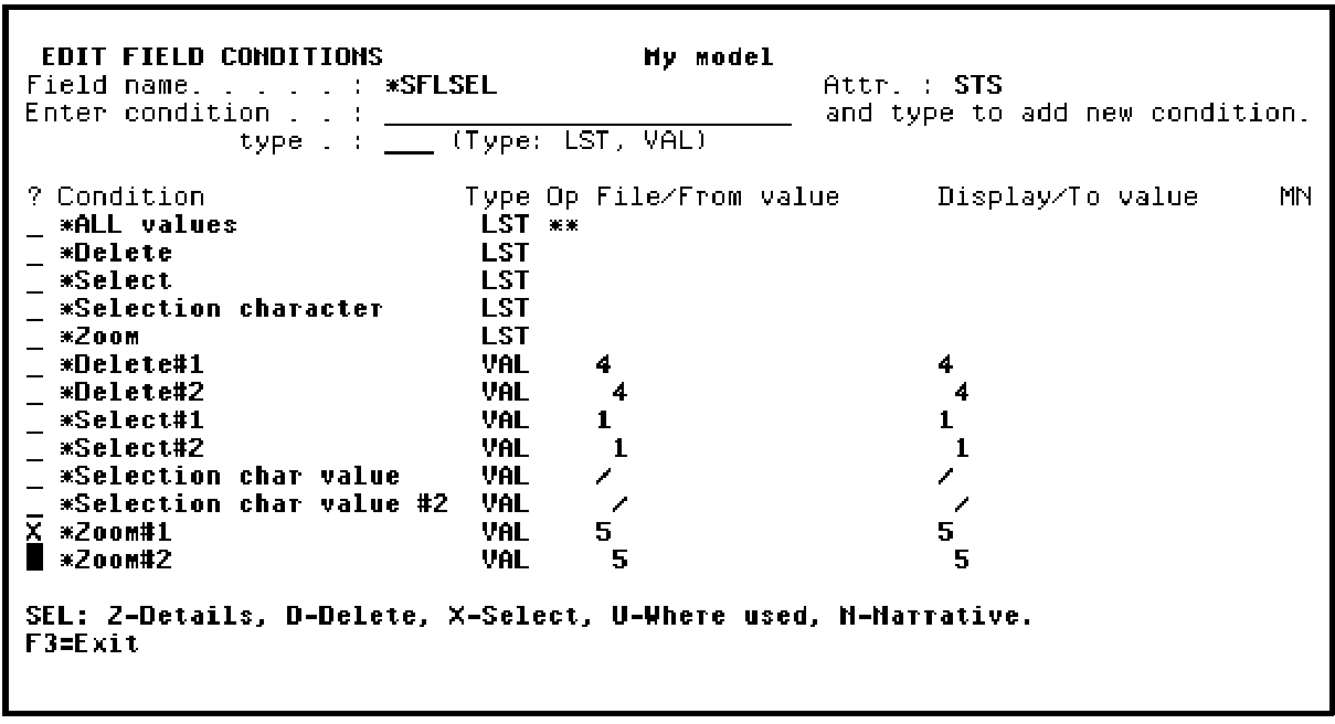 The Edit Field Conditions panel shows the existing conditions for the *SFLSEL field. You may select an existing condition or create a new one.