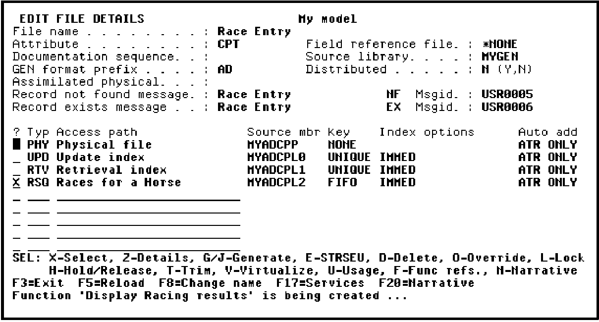 Now select the new access path for use in the Display Racing results function. Type X to select the Races for a Horse RSQ access path.