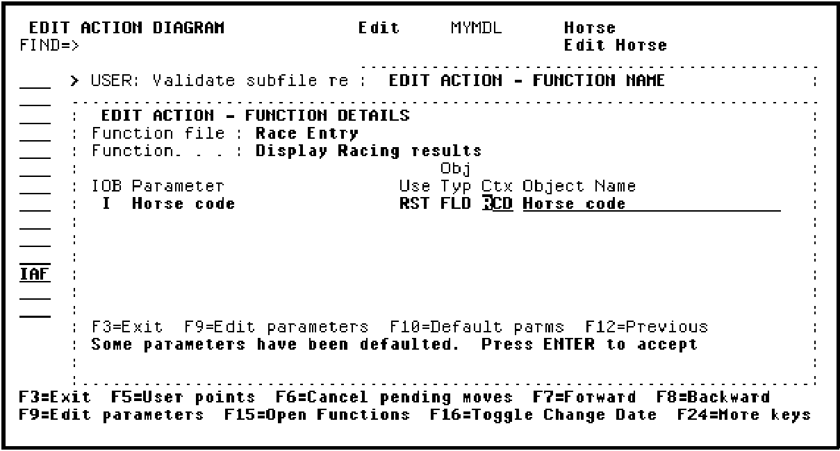 This window confirms that you have selected Display Racing results as the function for your action. CA 2E has defaulted the value of Horse code from the subfile record to pass as the parameter to the Display Racing results function. Note the RCD context.