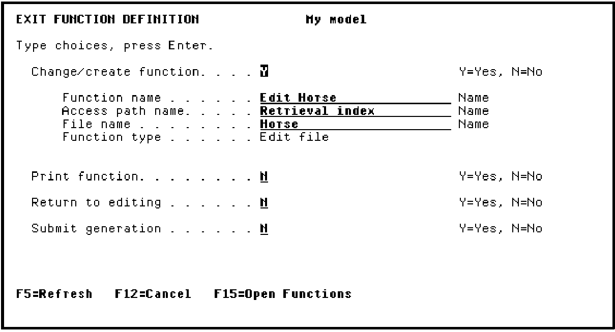 Accept the default of Y (Change/create function) by pressing Enter. You have now completed the update to the action diagram for Edit Horse.