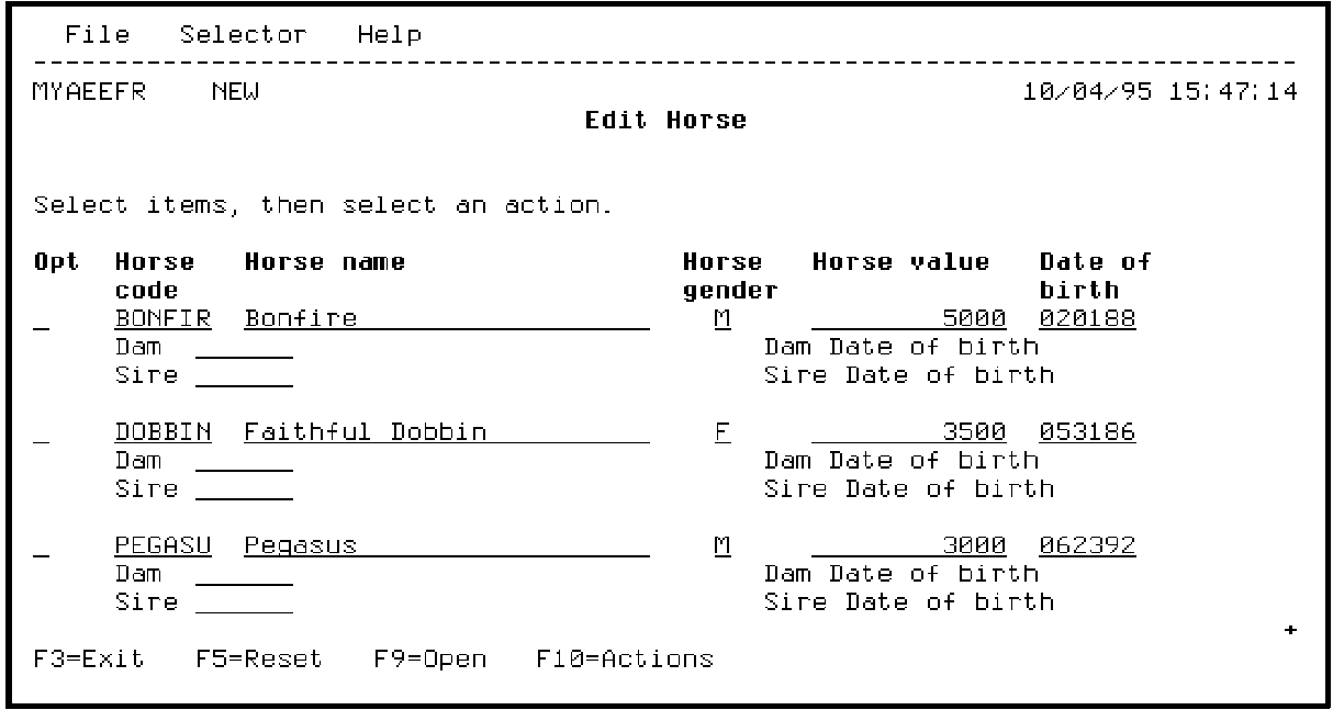 An empty input panel is displayed. Note that the program mode is New. This is where you may add new data. The panel should have the design you created and data should be validated according to the rules you specified in the design. Test this out by entering invalid values. Also try pressing F4 for the Horse gender field to display a selection list of available values.