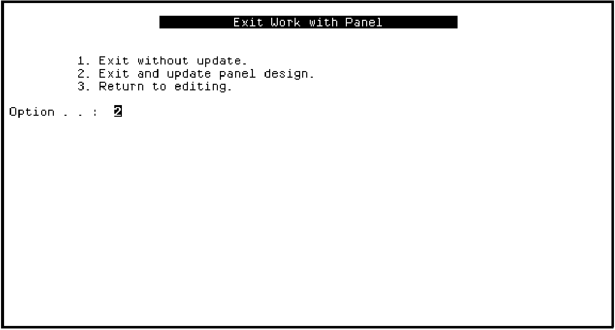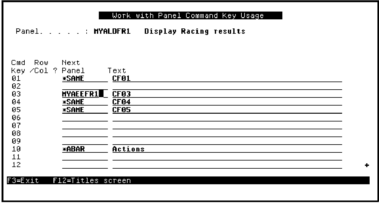 Since the Display Racing results function is called from the Edit Horse function, the F3 command key should return to Edit Horse. Type the name of the Toolkit panel design that corresponds to the Edit Horse function in the Next Panel column for the F3 command key as shown. By default this is the function’s implementation name followed by a 1; for example, MYAEEFR1.