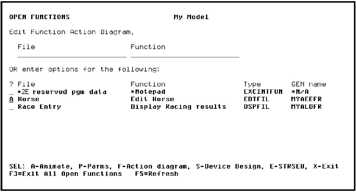 In this step you will set up the command key and action bar navigation for the Edit Horse function so you can simulate the link between the Edit Horse and the Display Racing results functions using Toolkit.