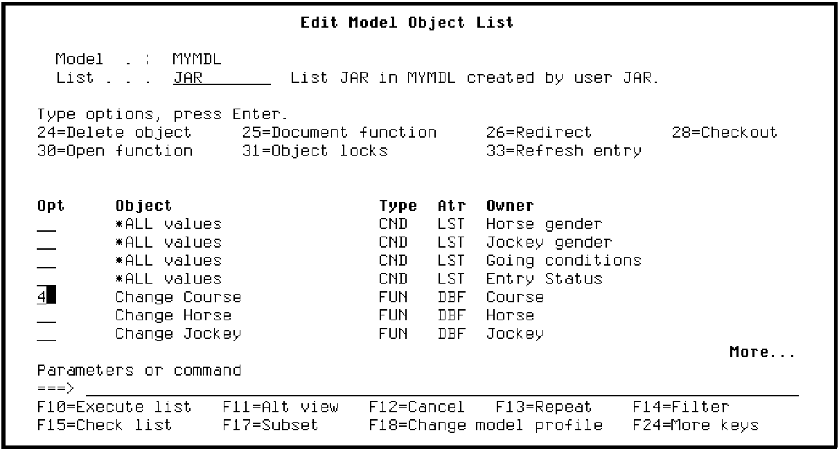 The Edit Model Object List panel provides two deletion options. Option 24 deletes the actual model object from the model; option 4 deletes a list entry from the displayed model object list. When you delete a model object list entry (option 4),CA 2E displays a confirm panel for each selected list entry.