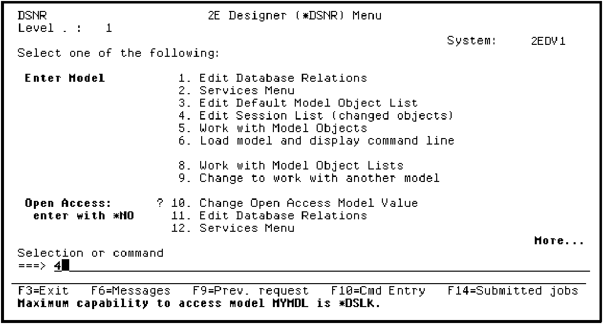 The Edit Model Object List panel should be displayed on your screen for your session list. If it is not, from the Designer Menu, type 4 on the Selection line as shown to select the Edit Session List (changed objects) option.