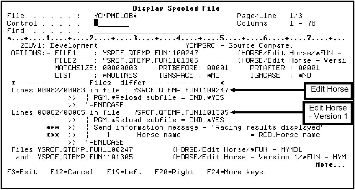 Press Enter. Use Subfile selector option 5 to display the job named YCMPMDLOB$. The differences are shown as follows.