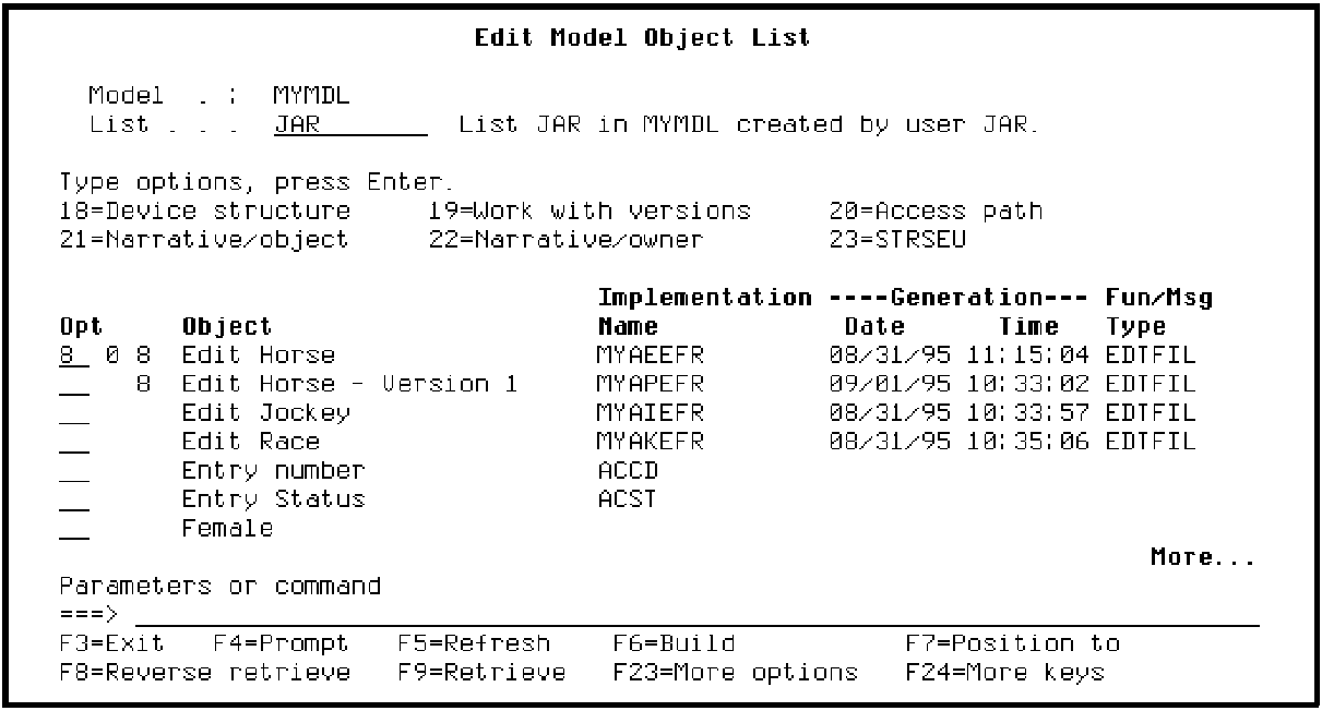 To view current details for a model object, use Subfile selector option 8. (Note that you can press F23 to see other options.) For example, type 8 against the Edit Horse list entry.