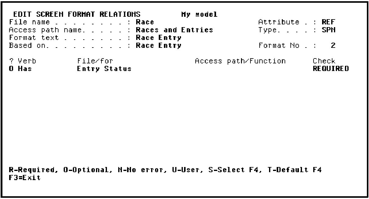 This displays the relations for the subfile record format. You specify optional relations by typing O against the relations.
