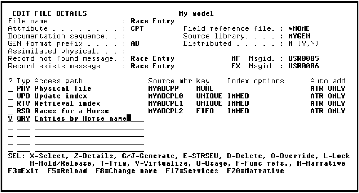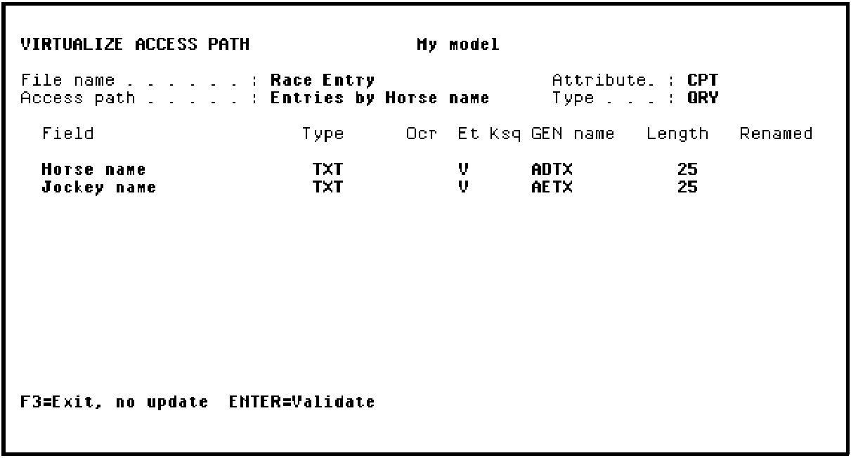 Press Enter to view the virtual entries that are available for inclusion on the access path; namely, Horse name and Jockey name.