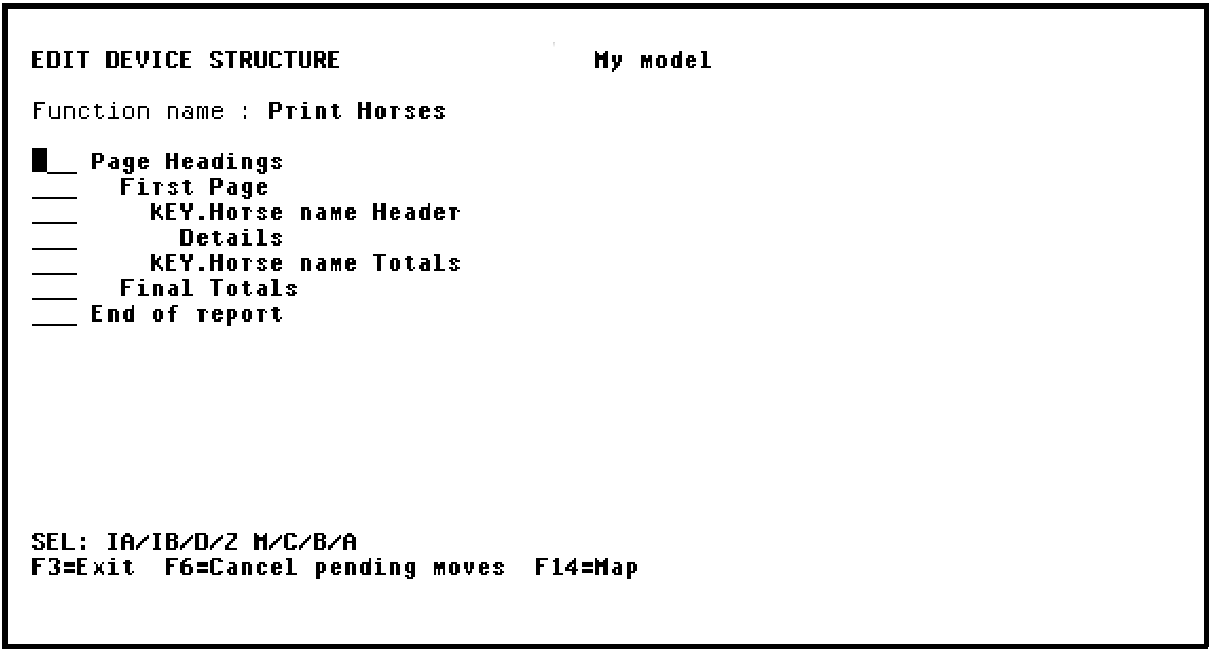The next step is to combine the two functions so that the records from the Print Object function (each race entry) will be printed after each detail record in the Print File function (after the horse to which it applies). To do this, you will use the Edit Device Structure panel.