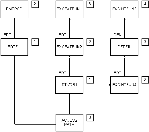 - Checks the model objects at level 2. The result depends on the way in which the level 1 object uses Access Path. In this example the RTVOBJ function uses Access Path as the based on access path and for parameter definition. Specifically:
