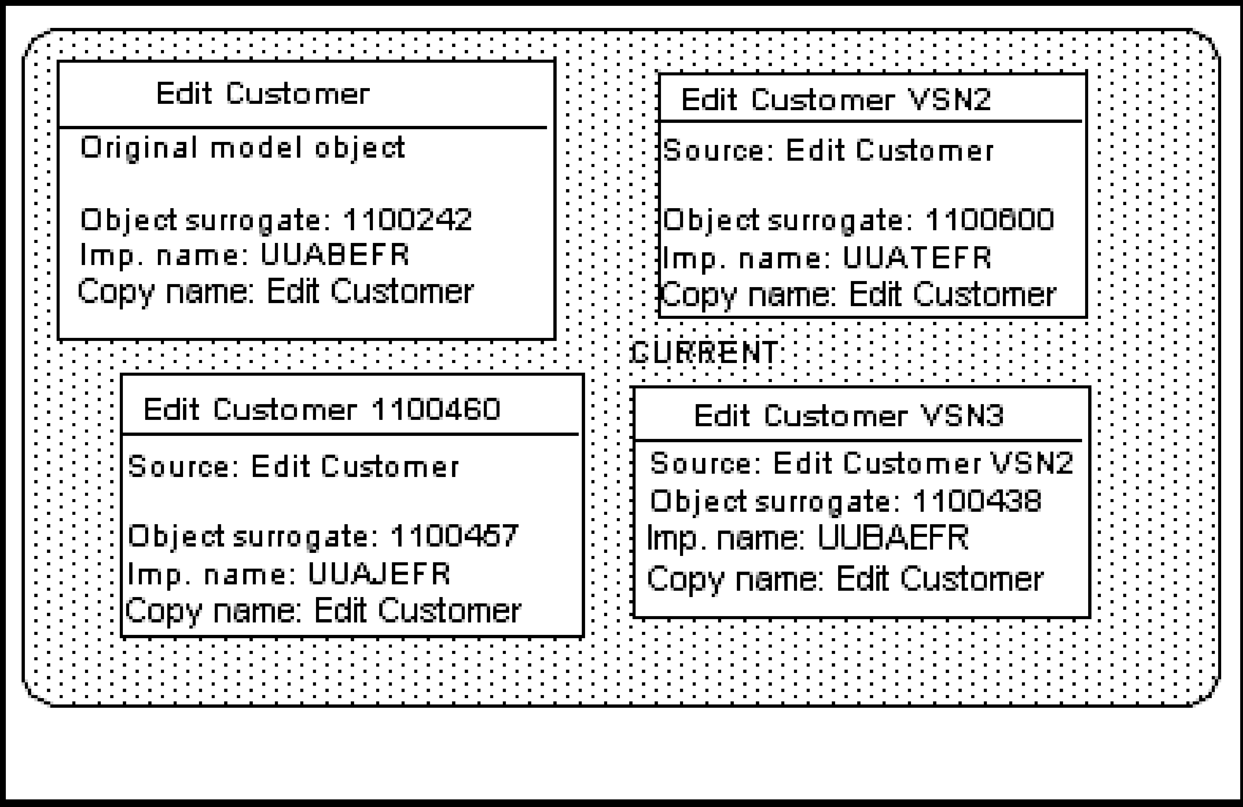 The following diagram illustrates basic concepts relating to versions. The original object in this diagram is the Edit Customer function; it has three versions. These four functions comprise the version group for Edit Customer.