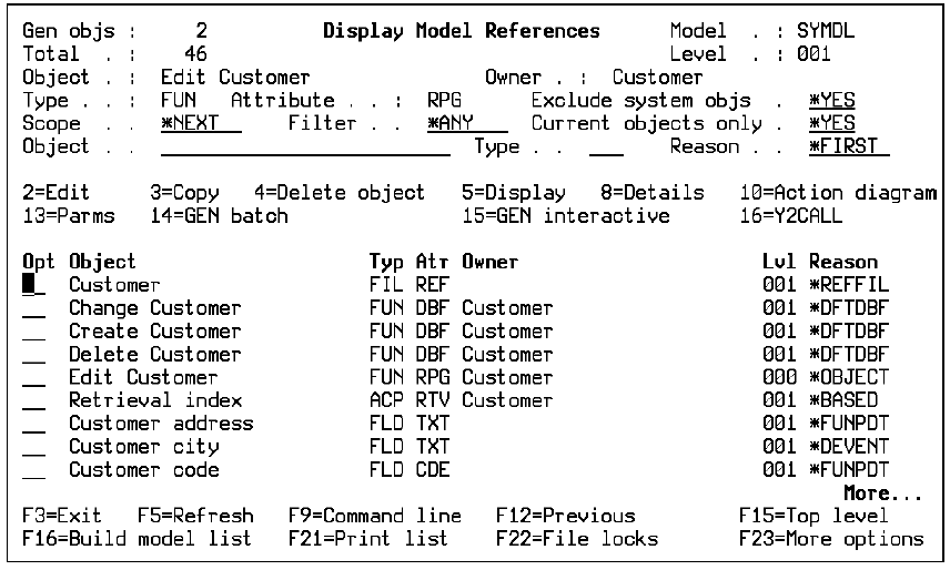 Use the Edit Model Object List panel over the All Objects list (*ALLOBJ). Press F7 to display the positioning windows. Press F11 until the Position by Implementation name window displays: