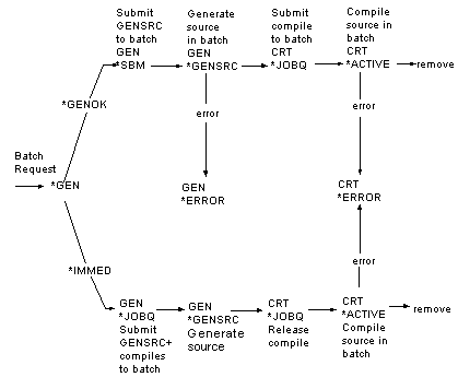 The following diagram shows the batch generation stages for both *GENOK and *IMMED. Notice that members have a GEN stage flag during generation, which changes to CRT once generation, is successful.CA 2E automatically submits members for compilation that have a CRT stage flag.
