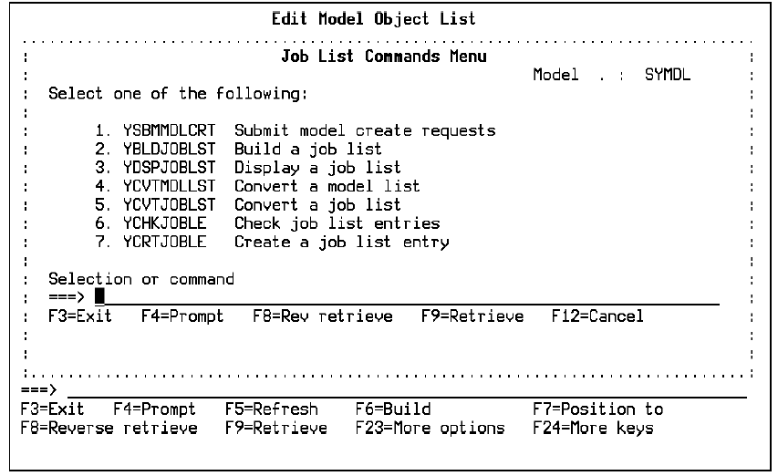 Enter the appropriate menu option on the command line to prompt the selected command. Many of the parameter defaults for the job list commands are set in your model profile.