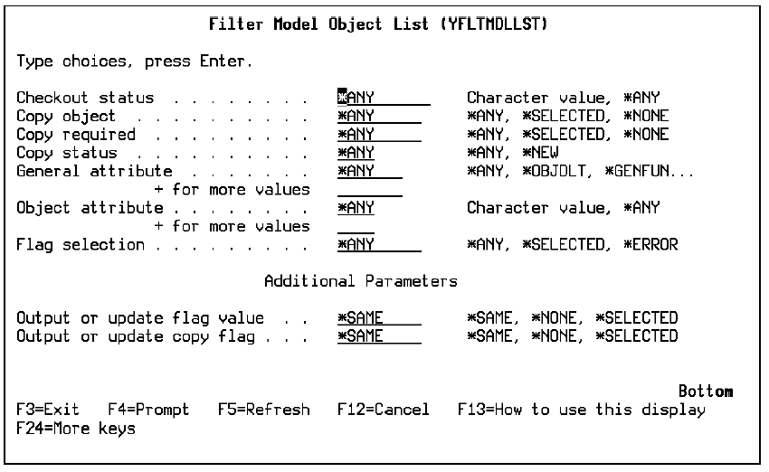 To apply the filtering tools to the current model object list, press F14. The Filter Model Object List panel displays. Press F10 to display the additional parameters.