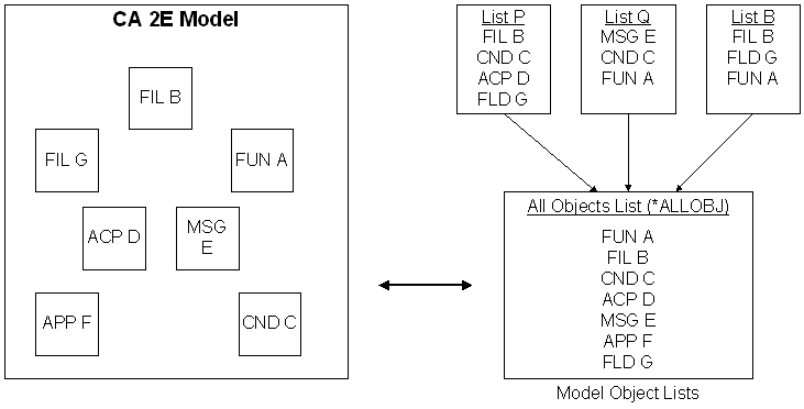 As shown in the diagram, model object lists can include model objects of different object types. You can use a model object list to group related objects into a set in the same way application areas let you group files. This enables you to manipulate or process a set of model objects with a single command or to easily process a series of tasks required as a result of a change to your model.