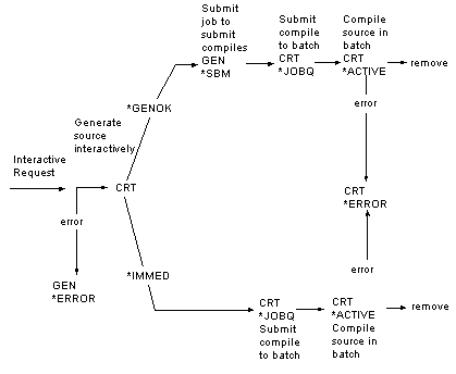 The following diagram shows the stages for interactive generation for both *GENOK and *IMMED.